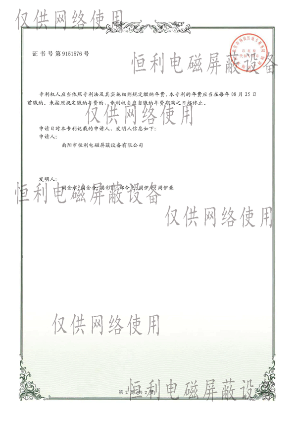 電磁屏蔽門用門鎖裝置專利證書展示圖