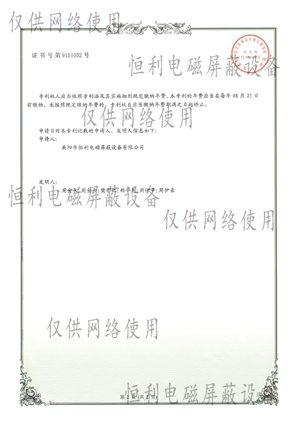 一種手電分離鎖緊電磁屏蔽門專利證書
